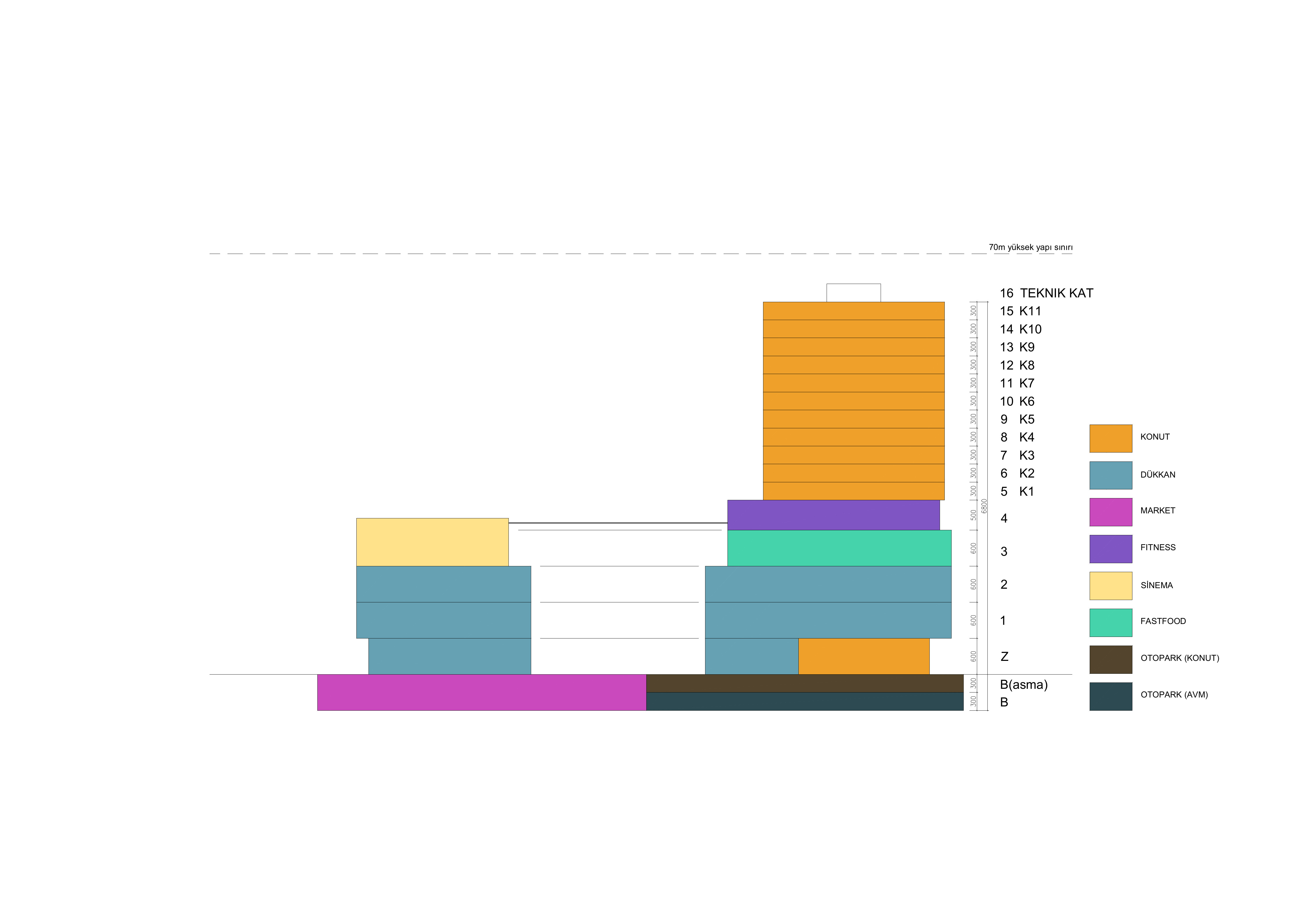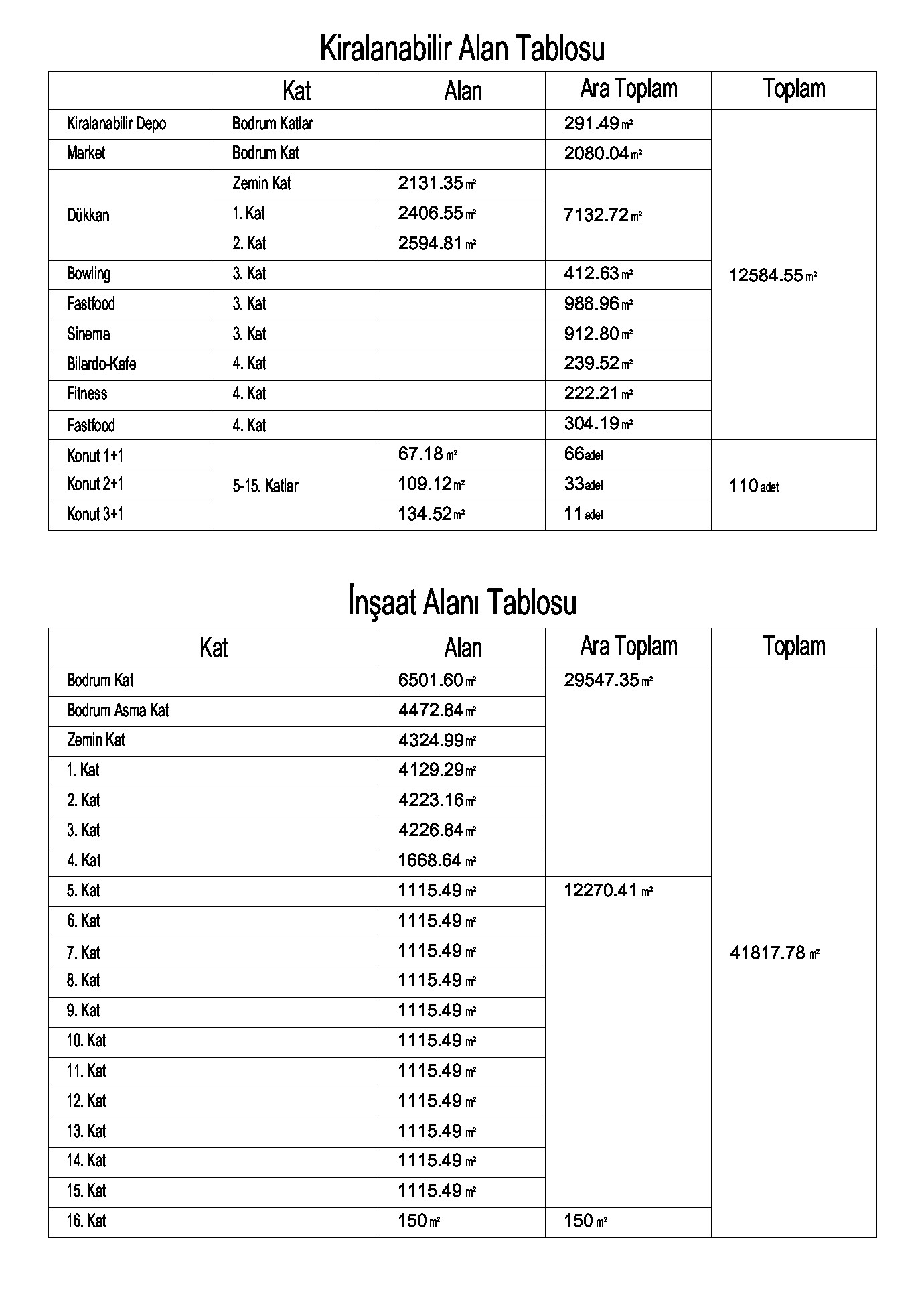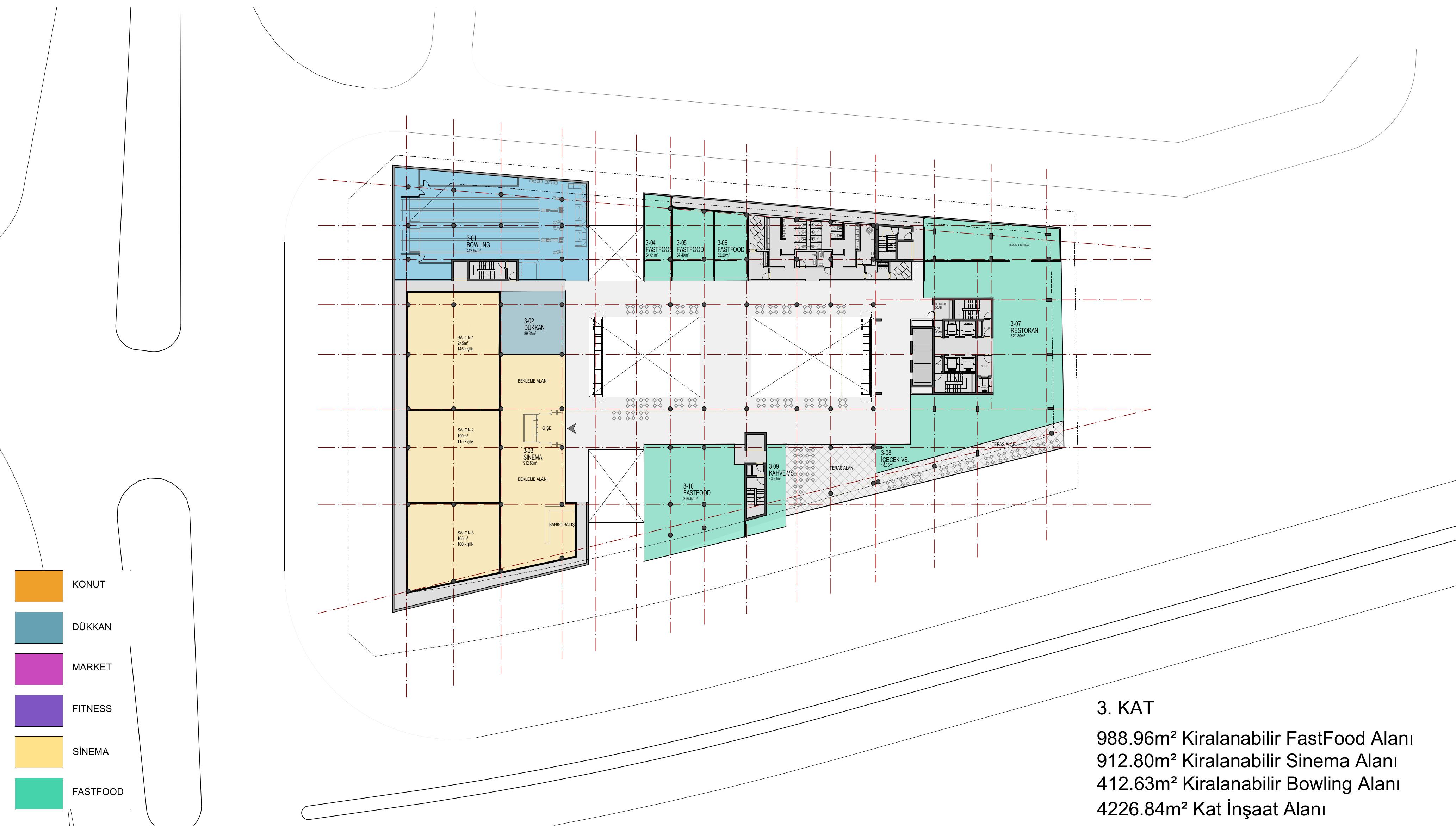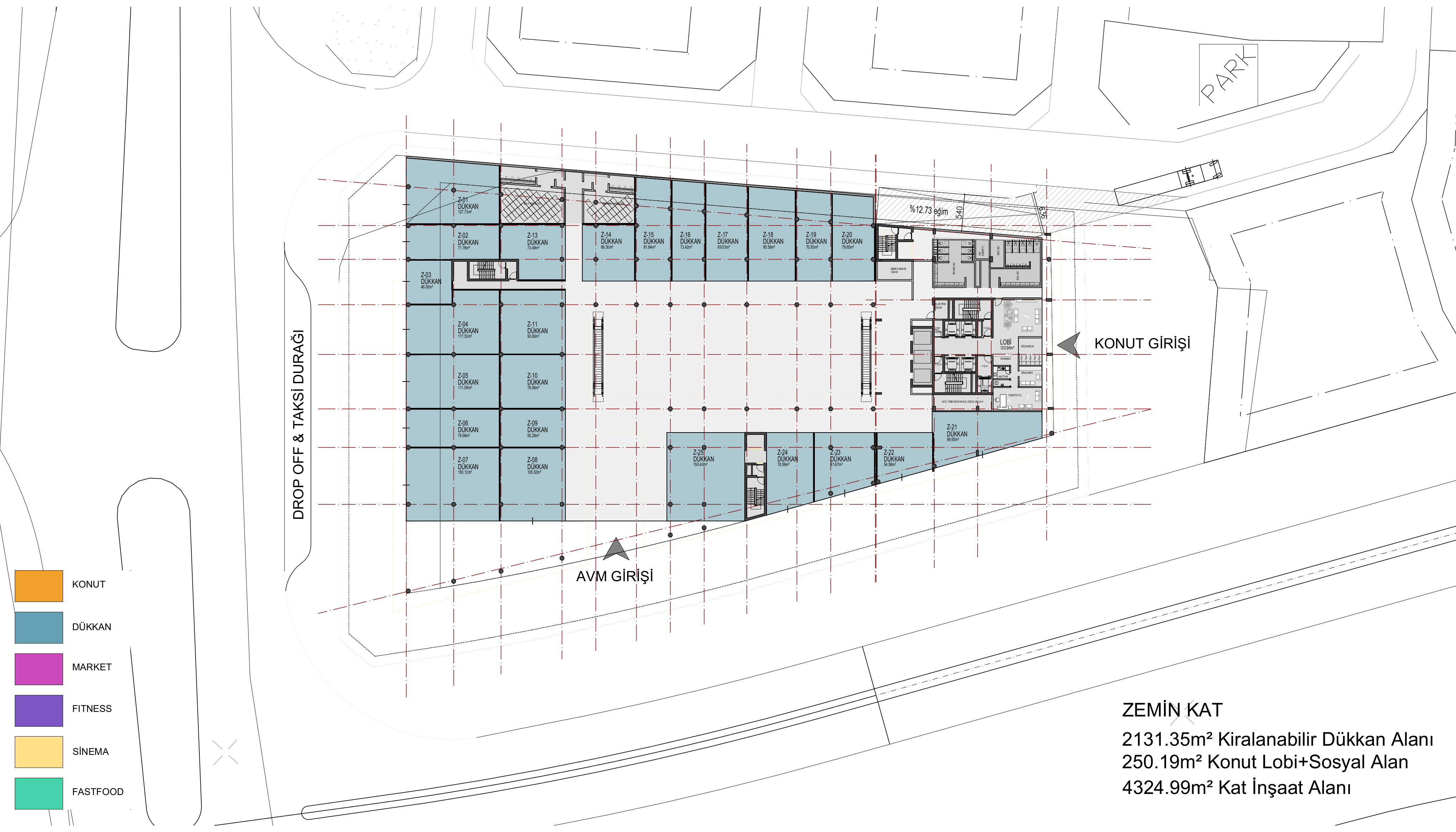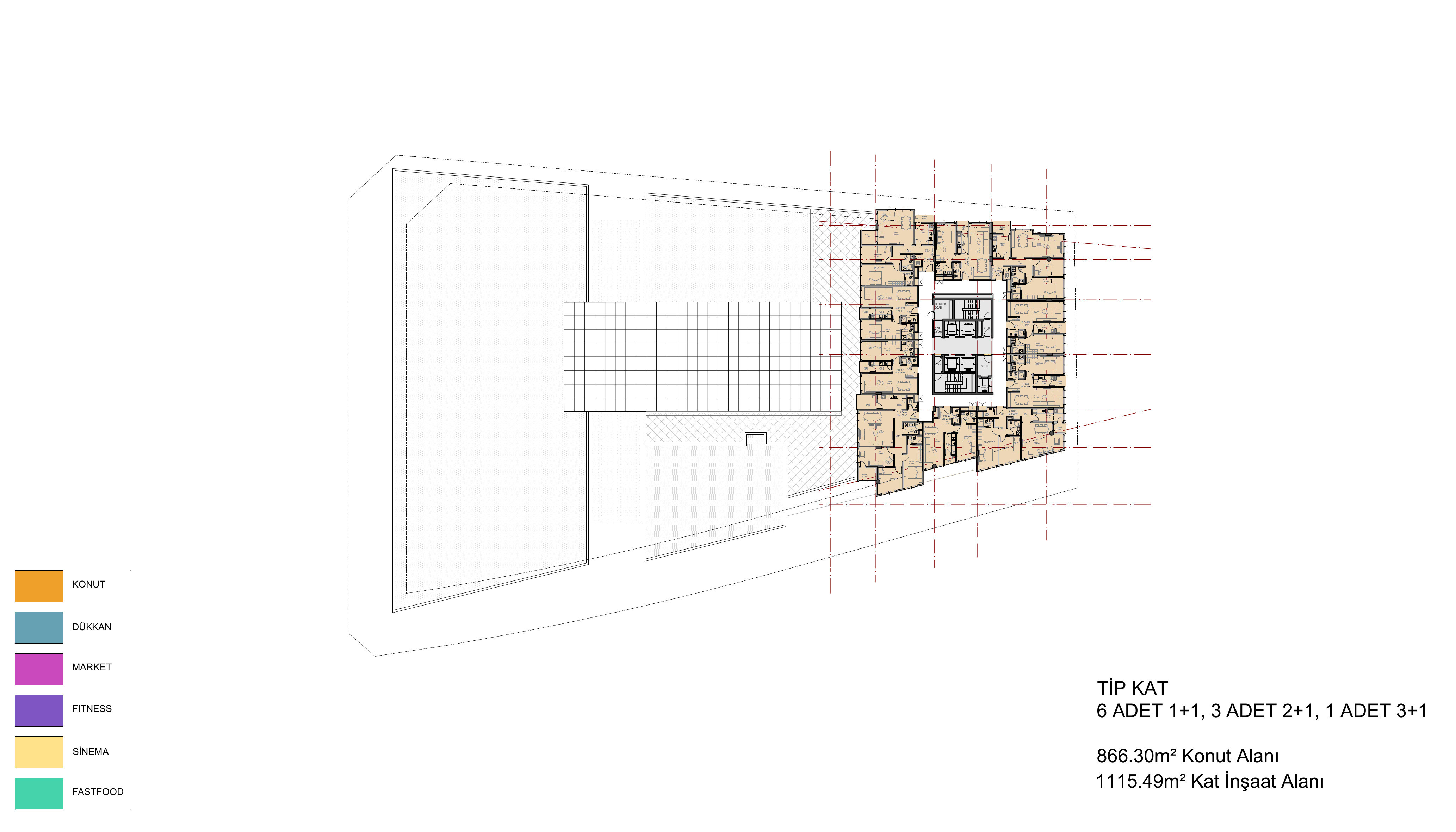AVM kısmı 2080m²’lik bir market, dükkanlar, bowling, fastfood, sinema, bilardo, fitness birimleri, konut kısmı ise 1+1, 2+1 ve 3+1 konut tipolojilerinden oluşmaktadır.