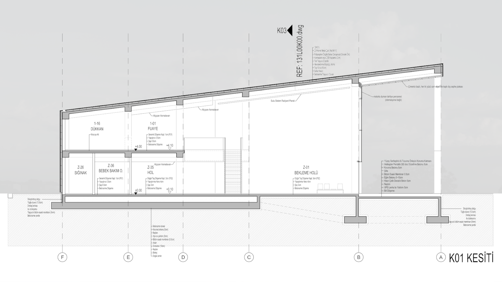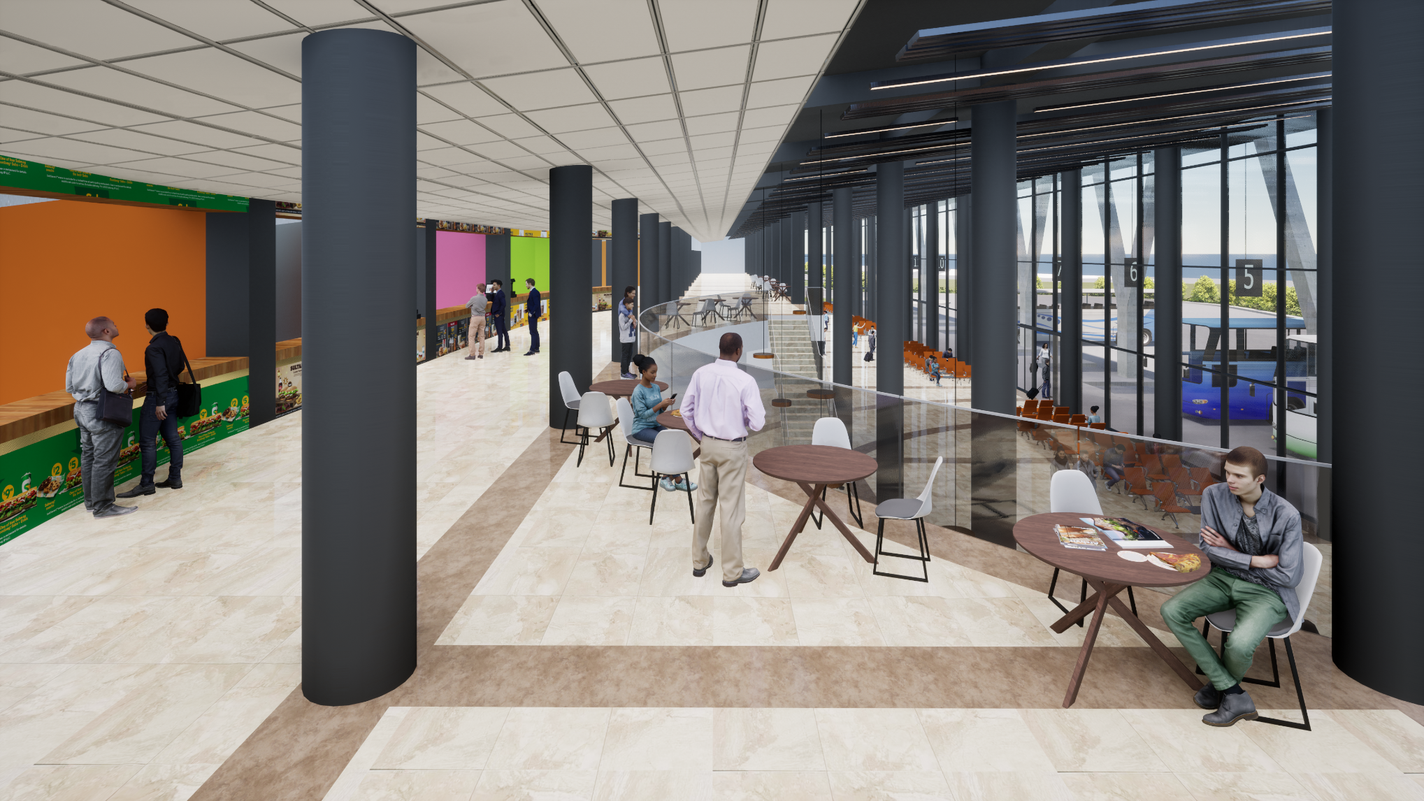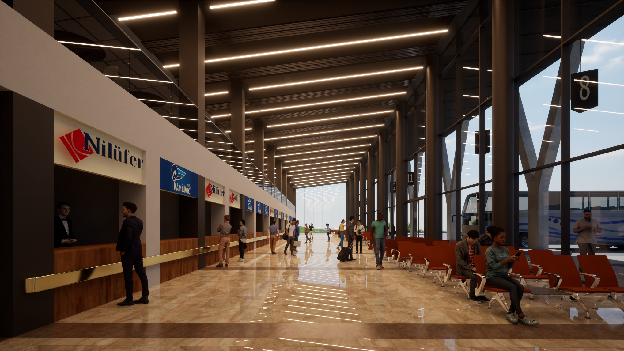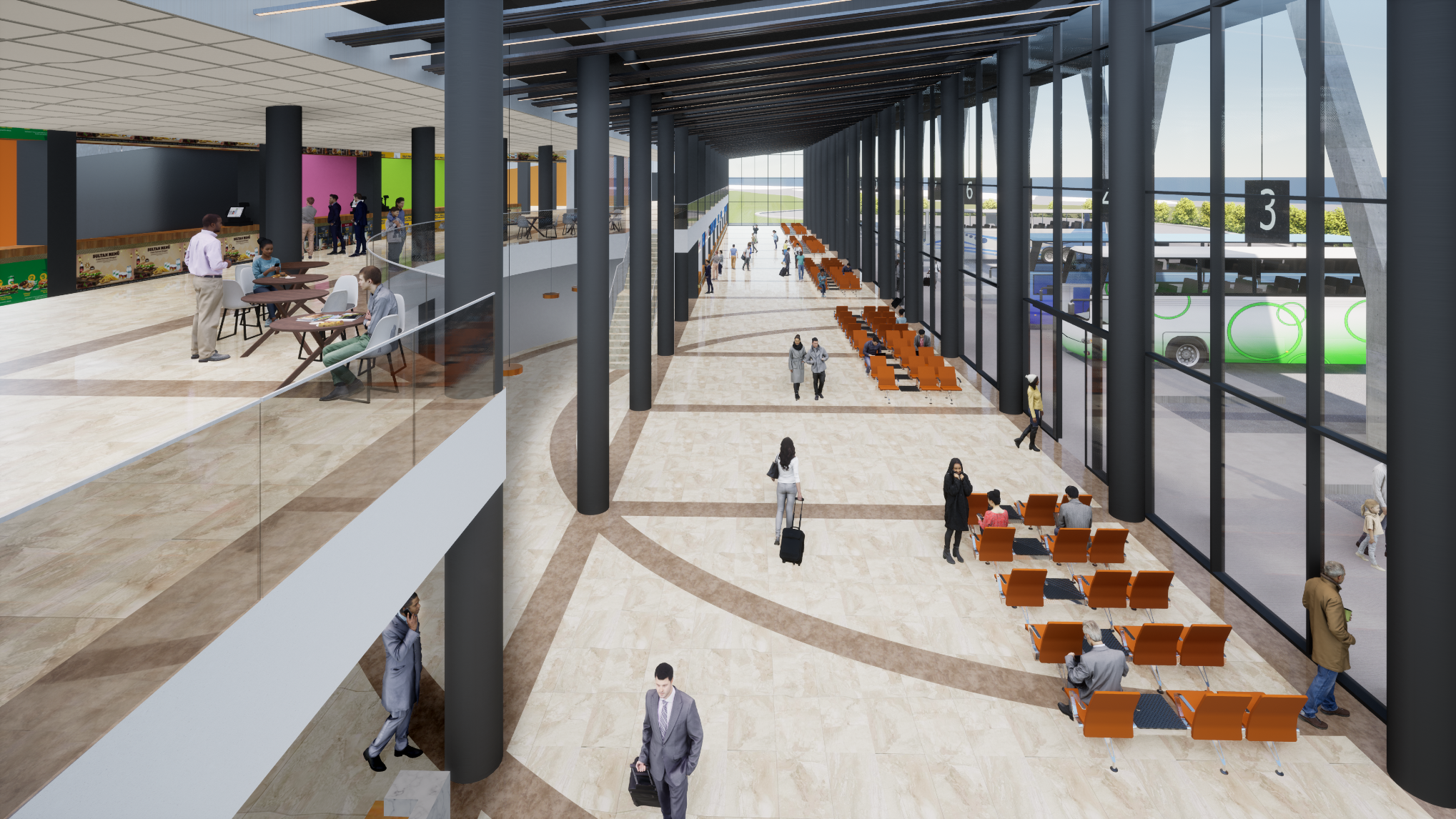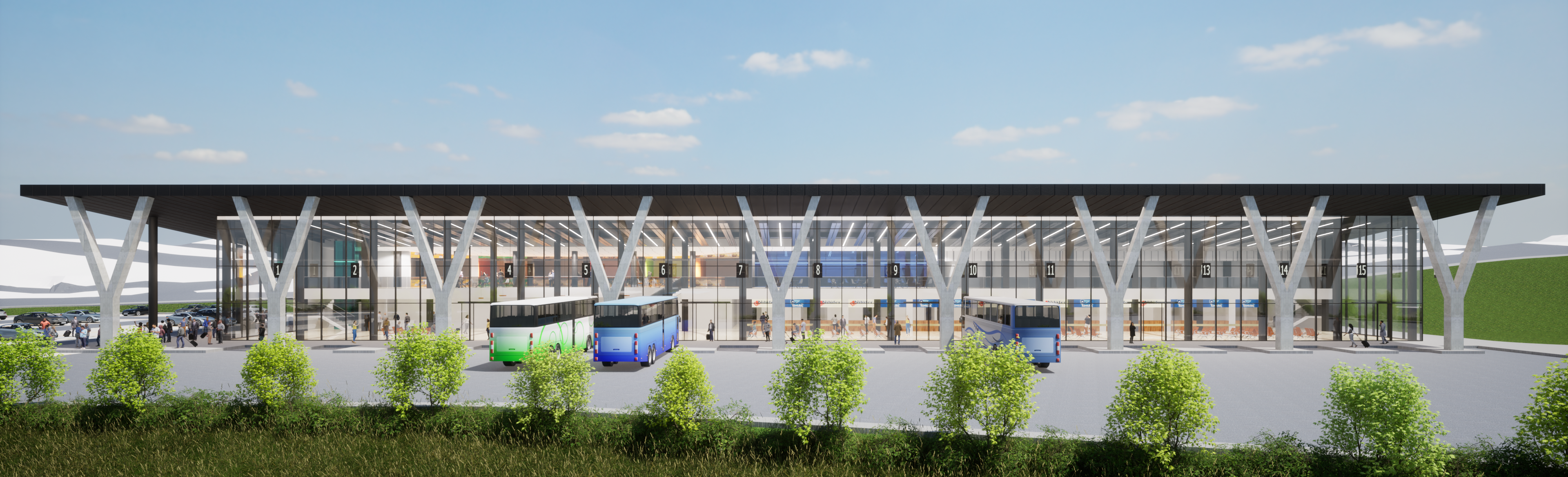 Terminal; 16 peron ve bilet satış ofisi, 196 araçlık açık otopark, asma katta yeme-içme mekanları, yönetim ofisi, yapı boyunca uzanan ana hol, ıslak hacimler ve teknik birimlerden oluşmaktadır. Tavan tipi sulu sistem radyant paneller ile ısıtma, otomasyona bağlı motorlu duman tahliye pencereleri ile doğal yolla havalandırma planlanmıştır.