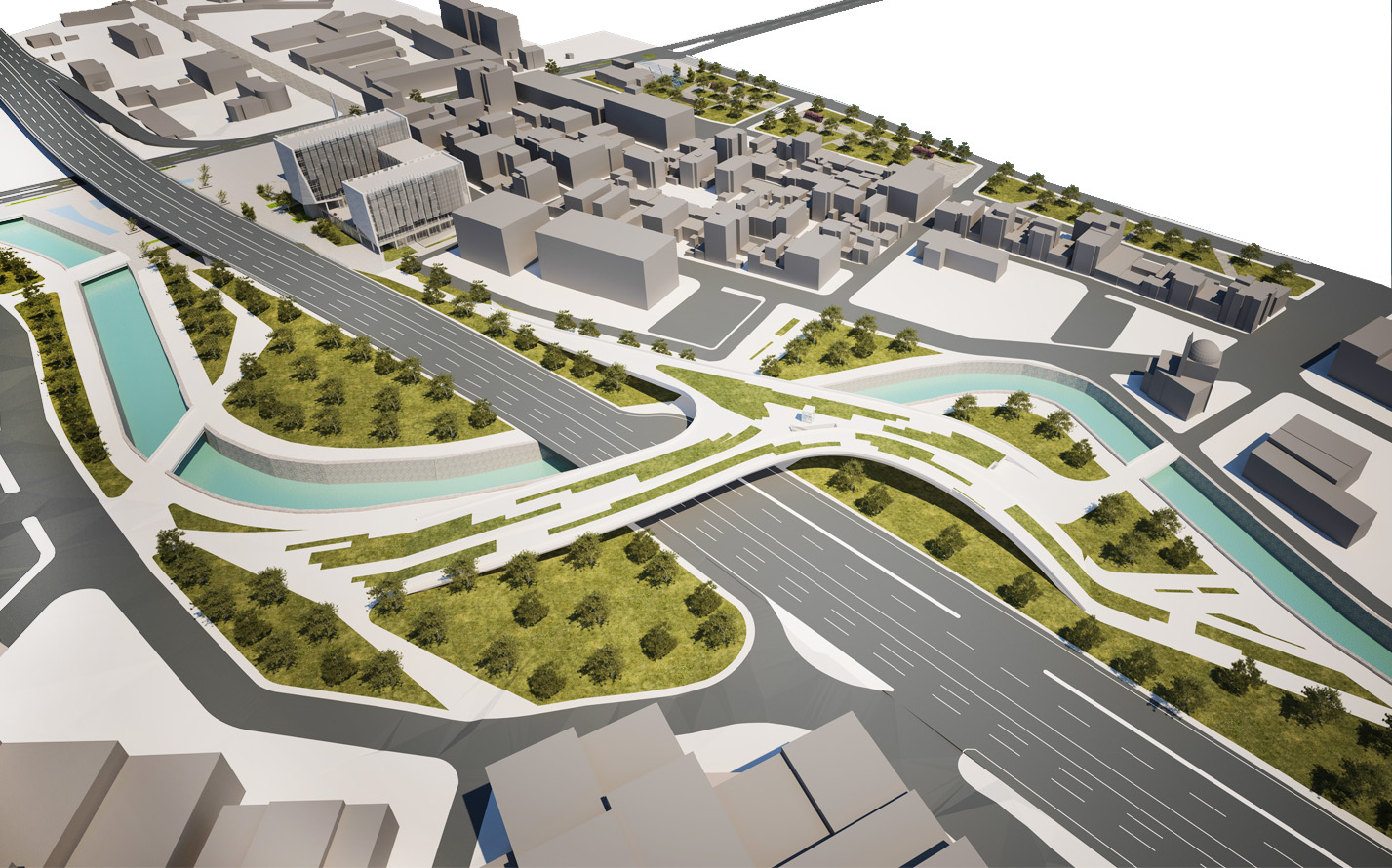 Belediye binası arsası ile Melez Deresi yeşil kent omurgasını birbirinden koparan, Yeşildere Caddesi ve Gaziler Caddesi arasındaki bağlantı yolları iptal edilerek bu bağlantılar; 1 nolu yarışma alanının güney ucunda kalan mevcut bağlantı ile Gürçeşme Caddesi’nden ve imar planında 15m’lik yol olarak genişletilen 1309 sk.’tan sağlanmıştır. Böylelikle belediye binası ve meydanının Melez Deresi’ne açılımı sağlanmış, arsasının hemen batısındaki taşıt üstgeçidinin altı düzenlenerek yeşil kent omurgasıyla belediye binası arsası bütünleştirilmiştir.