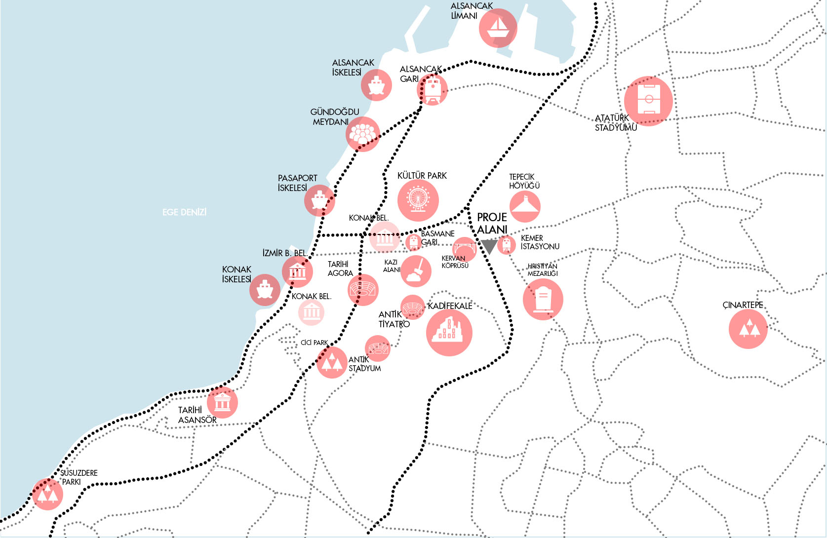 Üst ölçekte ilk üzerinde durulan, ulaşım problemlerinin yaya odaklı çözümü olmuştur. Bunun için Gaziler caddesindeki batçık iptal edilerek, alanın doğusunda bulunan “İzban” hattının yerin altına alınması; tarihi Kemer Gar Binası odaklı bir meydan oluşturularak trene erişimin yerin altında çözülmesi önerilmiştir. Bu sayede;
