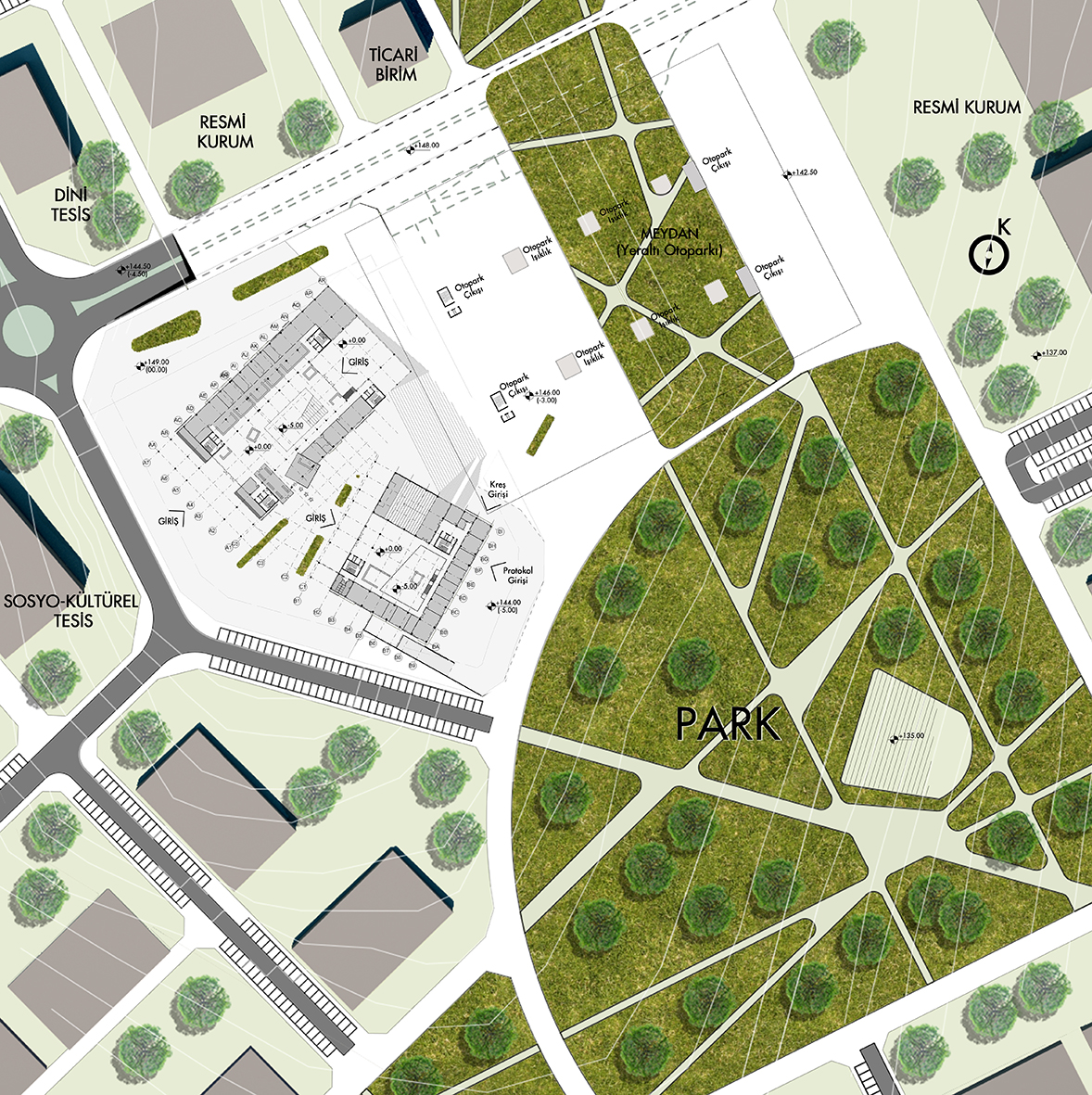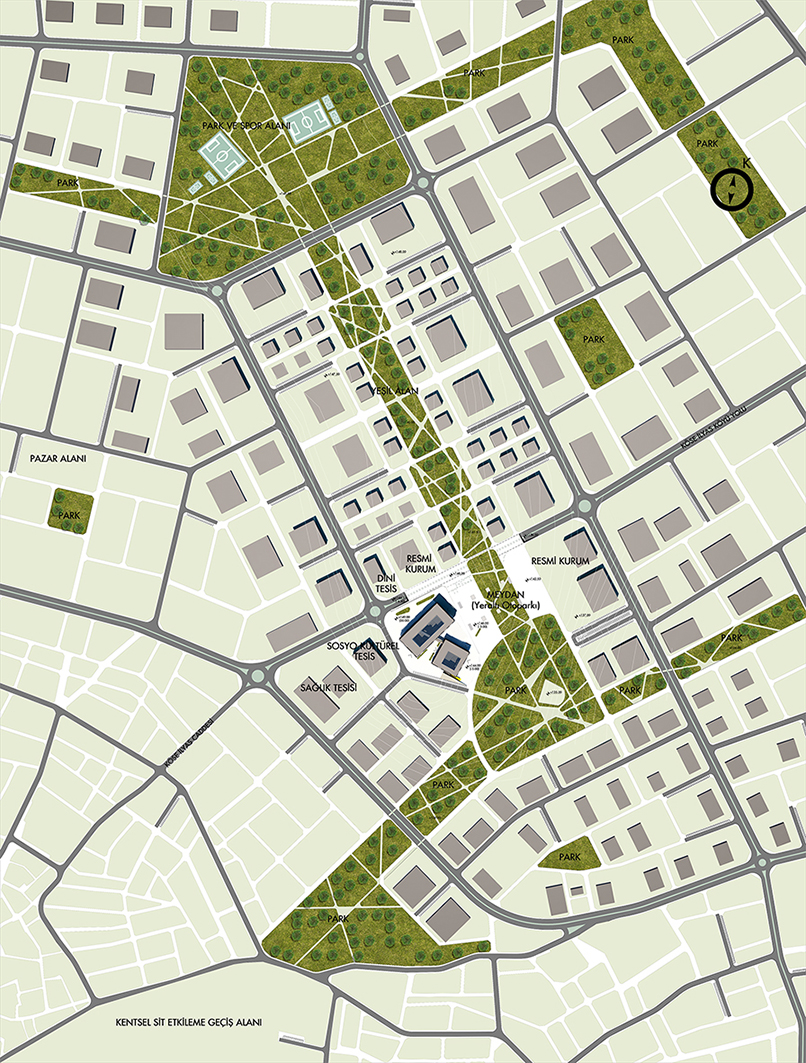 Kuzey-güney aksı boyunca uzanan yeşil aks, belediye meydanında da devam ettirilmiş, böylelikle aktif yeşilin sürekliliği sağlanırken meydanın da mekansal ve işlevsel olarak zenginleşmesi sağlanmıştır.