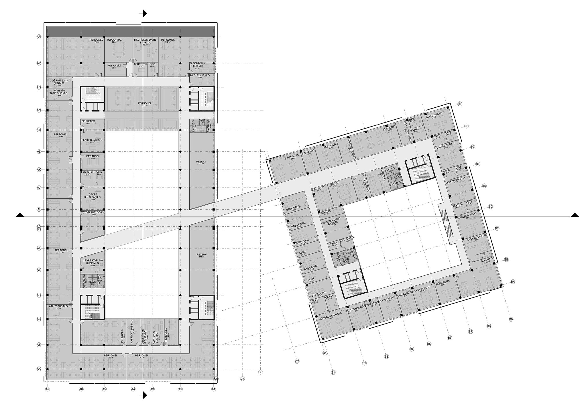 Belediye binası iki ana kütle halinde çözülmüş, başkanlık ve ilgili birimleri ile doğrudan hizmet birimleri birbirinden ayrılmıştır. Bu iki kütle; konferans salonu, çok amaçlı salon ve meclis salonunun ve ilgili servis birimlerinin bulunduğu alt zemin ve başkanlık katındaki bir köprü ile birbirine bağlanmaktadır.