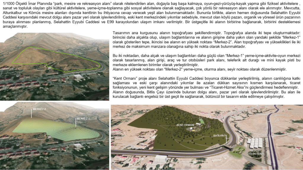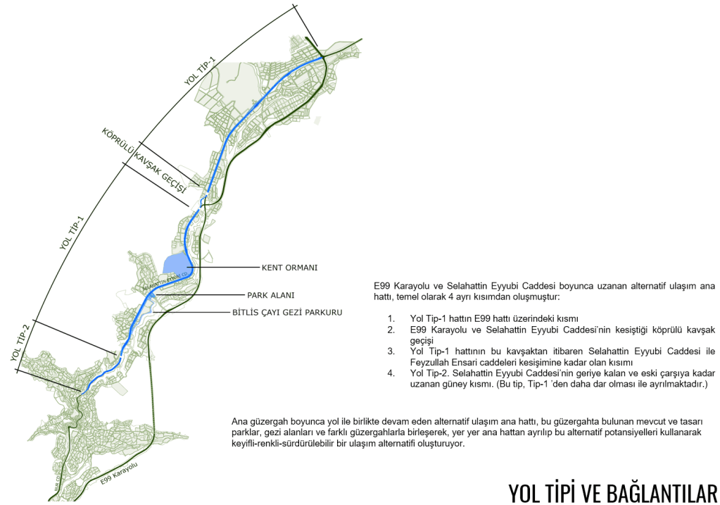 Özellikle iki ana arter ulaşım hattının kesişim noktasından eski çarşı merkezine kadar olan kısım; rekreasyon ve aktivite alanları, yürüyüş rotaları, alternatif spor aktiviteleri (paintball, at binme vb), dinlenme alanları gibi öğeler kullanılarak sürdürülebilir bir kullanıma ve doğal turizme katkı yapacak bir kentsel öğe biçiminde kurgulanmıştır. Bununla birlikte, 1/1000 Ölçekli imar planında park, mesire yeri ve rekreasyon alanı olarak tanımlanan alanda tasarlanan “Kent Ormanı” projesi ve halihazırda bulunan Ticaret Merkezi ile doğrudan ilişki kurarak, bunları taşıyan-güçlendiren-zenginleştiren bir aktif yeşil omurga tasarlanmıştır. Selahattin Eyyubi Caddesi, özellikle Ticaret Merkezi, Hükümet Konağı, Bitlis Belediyesi fonksiyonlarının ard arda sıralandığı hat “Ticaret-Hizmet Aksı” olarak ele alınmış, yeni yapılacak AVM burada öngörülerek bu aks güçlendirilmiştir. Böylelikle aktif yeşil omurga olarak “Bitlis Çayı ve Vadisi”, “Ticaret-Hizmet Aksı” ve “Kent Ormanı” birini besleyecek, kullanım olanaklarını zenginleştirecek, cazibe oluşturacak şekilde bütüncül olarak tasarlanmıştır.