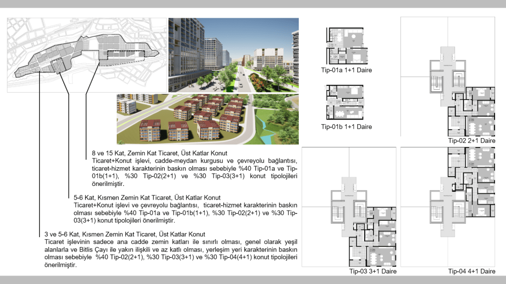 Yeni ve çağdaş, cadde-alışveriş-yeme-içme-buluşma mekanları, kamusal alanları planlanmış bir yeni kent yerleşim tipi eksiğine karşın, eski kent merkezinden görece uzakta kalan ve yeni kent gelişim yönünde bulunan bir konut gelişme bölgesi “Yüksek Katlı Konut Bölgesi” olarak seçilmiştir. Alanın iki ana arterden (özellikle çevre yolundan) besleniyor olması, Bitlis Çayının bir taraftan çevreleyerek kent kimliği ile bağlılık göstermesi ve doğal sınır oluşturması, Rahva düzlüğünde buluması gibi özellikleri, alan seçiminde etkili olmuştur. 1/1000 Ölçekli İmar Planına en az müdahale ile, yoğunluk önerisinde bulunulmuş, alışveriş-yeme-içme-buluşma mekanlarını karşılayacak bir “cadde” oluşturulmuş, çevre yolu ile bitişik adalarda yüksek yapılar yerleştirilerek buradan Bitlis Çayı bitişiğindeki adalara doğru yüksekliğin azaldığı bir yapılaşma öngörülmüştür.