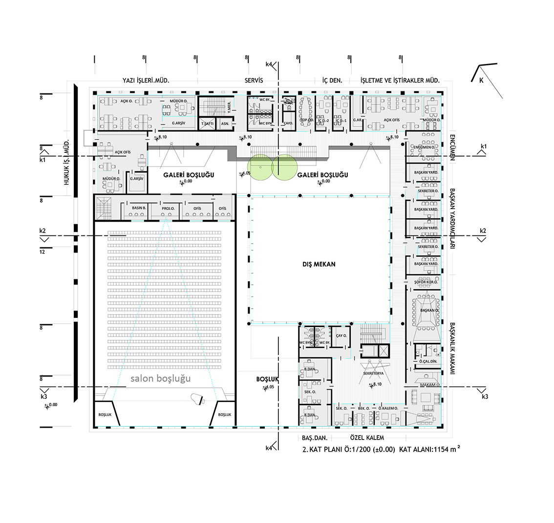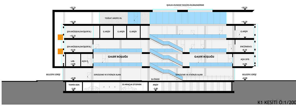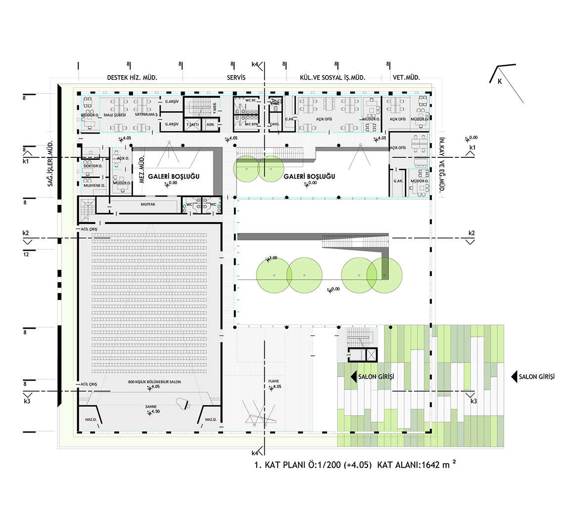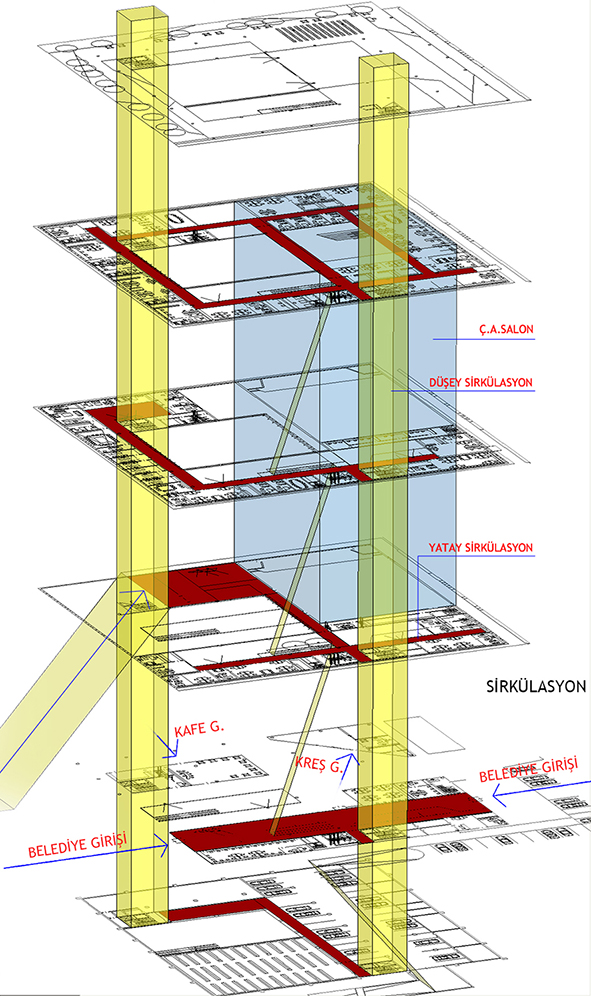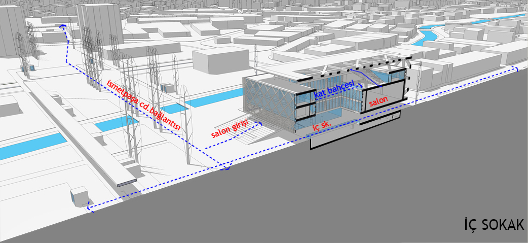 Çok amaçlı salonun en az 8m yükseklikte olması ve taban alanı düşünüldüğünde zeminde kapladığı alan artacağından, salon +4.05(1.kat) kotuna yerleştirilmiş ve zeminde parçalı boşluklu bir yapı oluşturulmuş, iç sokakla birlikte kamusallığı artırılmıştır.