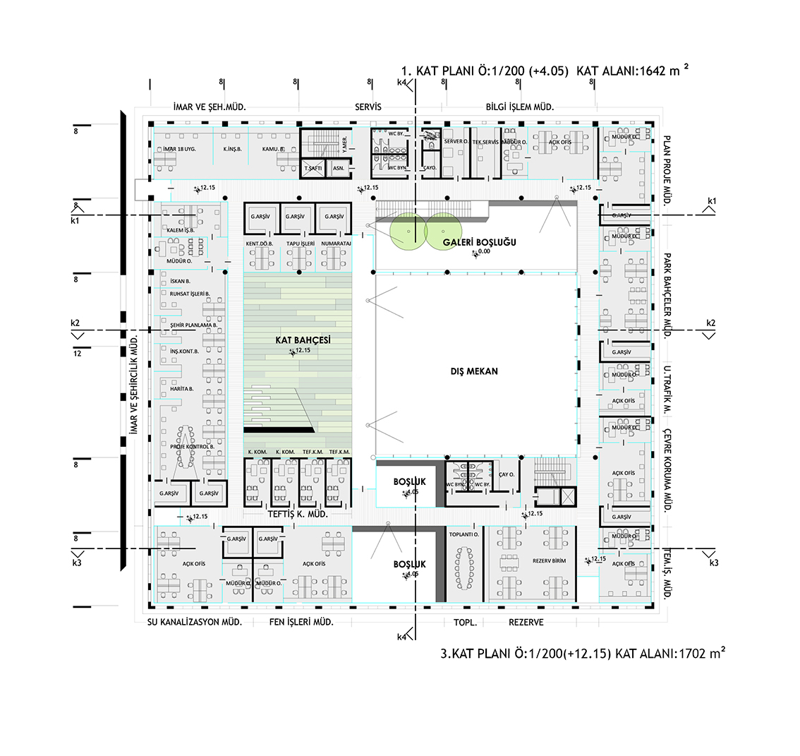 Mali hizmetler, zabıta müdürlüğü gibi birimler zeminde, başkanlık +8.10(2.kat) kotunda planlanmış, makam odası iki açılı yönelimi ile Uşak manzarası gören, dere ve kentsel dönüşüm alanına hakim bina köşesine yerleştirilmiştir. +12.15(3.kat) ise şehircilik, imar, fen işleri, plan proje gibi birimlere ayrılmıştır.