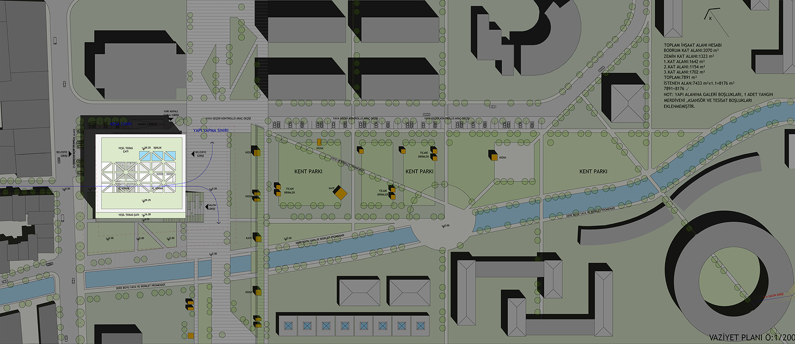 Kare formlu bina; iç avlu, galeri boşlukları, kat bahçesi ve bu bahçeyle bütünleşen etkin kullnılacak çatı arası terası ile zenginleştirilmiştir.