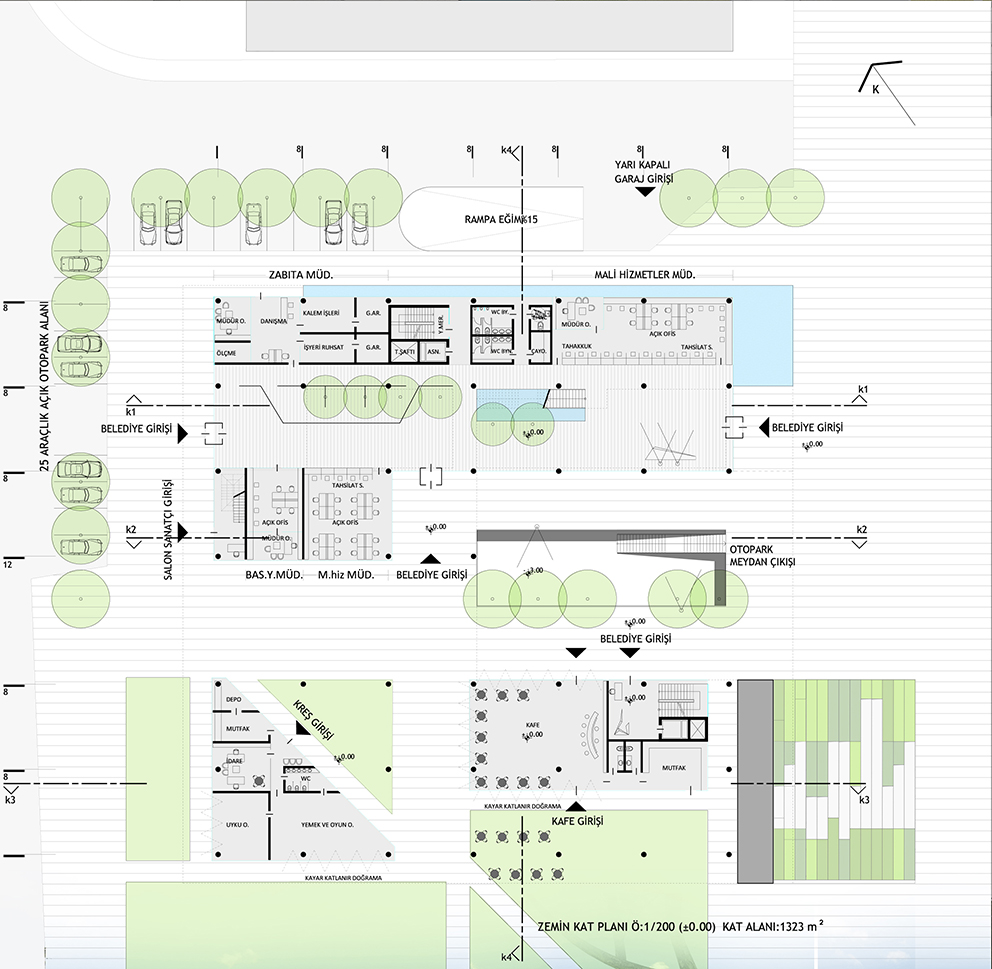 Yeni açılması planlanan sokak aksında projede iç sokak oluşturulmuştur. Kafe, kreş, çok amaçlı salon ve belediye birimlerinin ayrı ayrı çalışması gerektiği düşünüldüğünden zeminde iç sokakla desteklenen parçalı bir yapı oluşturulmuştur. Belediye girişleri, kafe, kreş birimleri, zeminde ve bağımsız düşünülmüştür.
