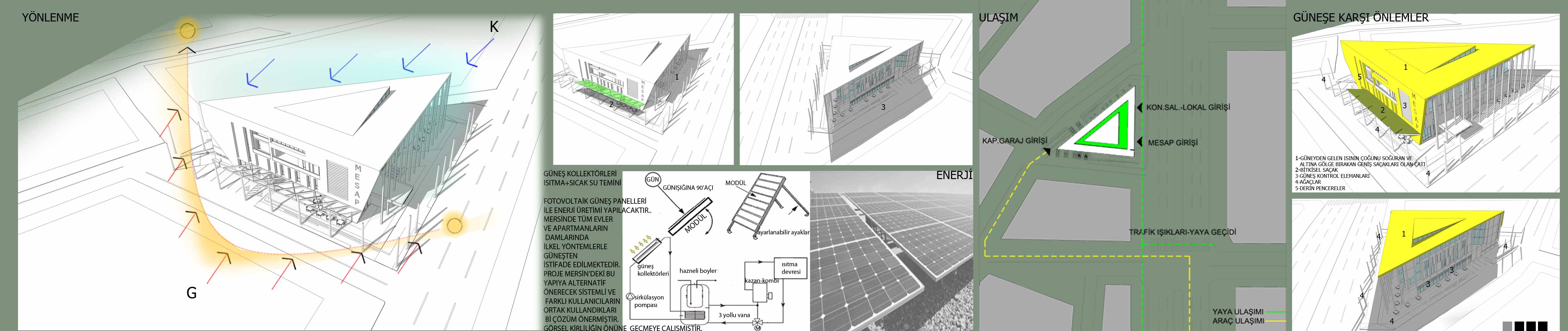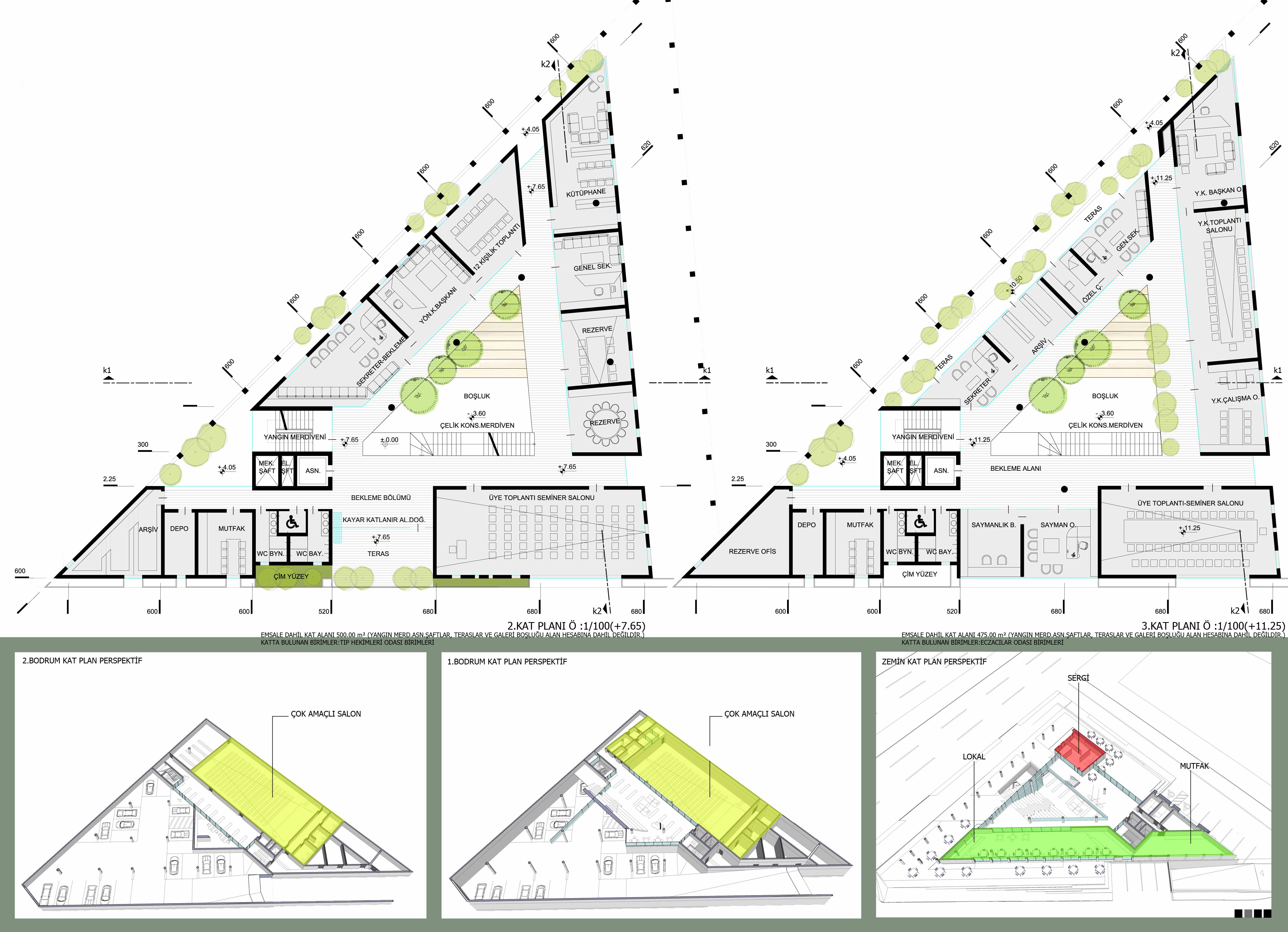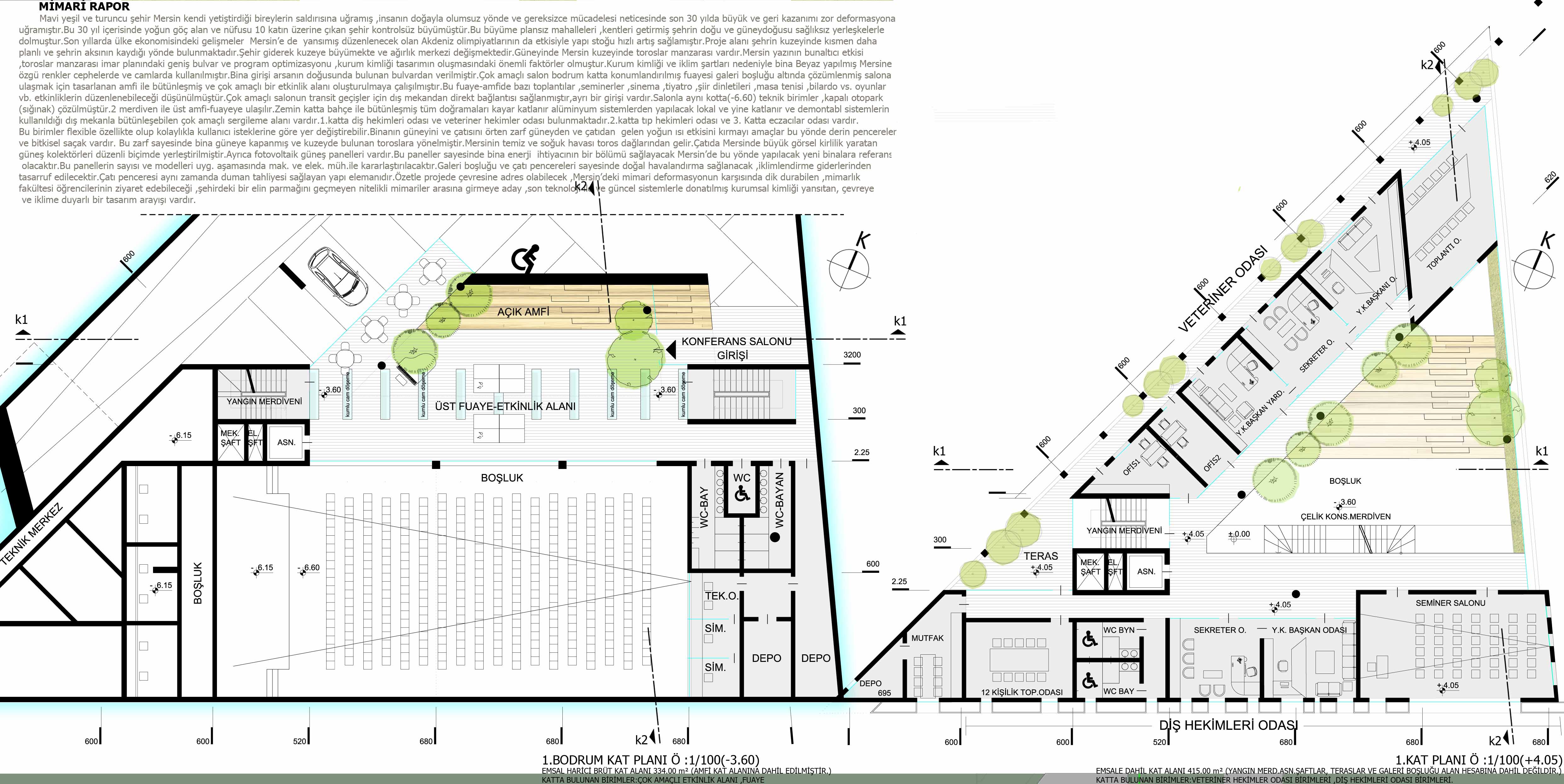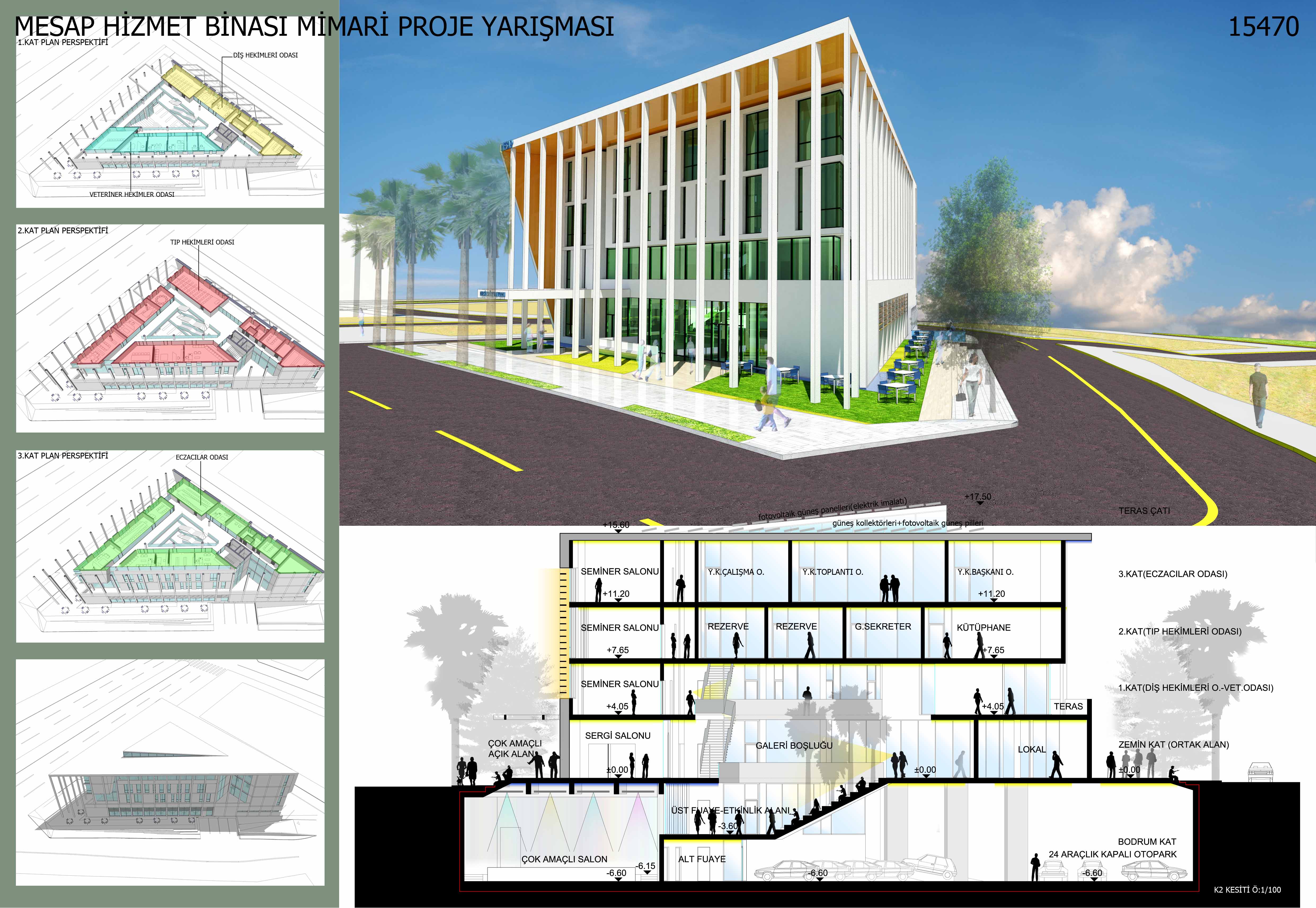 Mavi yeşil ve turuncu şehir Mersin kendi yetiştirdiği bireylerin saldırısına uğramış ,insanın doğayla olumsuz yönde ve gereksizce mücadelesi neticesinde son 30 yılda büyük ve geri kazanımı zor deformasyona uğramıştır. Bu 30 yıl içerisinde yoğun göç alan ve nüfusu 10 katın üzerine çıkan şehir kontrolsüz büyümüştür. Bu büyüme plansız mahalleleri ,kentleri getirmiş şehrin doğu ve güneydoğusu sağlıksız yerleşkelerle dolmuştur. Son yıllarda ülke ekonomisindeki gelişmeler Mersin’e de yansımış düzenlenecek olan Akdeniz olimpiyatlarının da etkisiyle yapı stoğu hızlı artış sağlamıştır. Proje alanı şehrin kuzeyinde kısmen daha planlı ve şehrin aksının kaydığı yönde bulunmaktadır. Şehir giderek kuzeye büyümekte ve ağırlık merkezi değişmektedir. Güneyinde Mersin kuzeyinde Toroslar manzarası vardır. Mersin yazının bunaltıcı etkisi, Toroslar manzarası imar planındaki geniş bulvar ve program optimizasyonu, kurum kimliği tasarımın oluşmasındaki önemli faktörler olmuştur. Kurum kimliği ve iklim şartları nedeniyle bina beyaz renkte yapılmış, Mersin’e özgü renkler cephelerde ve camlarda kullanılmıştır. Bina girişi arsanın doğusunda bulunan bulvardan verilmiştir. Çok amaçlı salon bodrum katta konumlandırılmış fuayesi galeri boşluğu altında çözümlenmiş salona ulaşmak için tasarlanan amfi ile bütünleşmiş ve çok amaçlı bir etkinlik alanı oluşturulmaya çalışılmıştır. Bu fuaye-amfide bazı toplantılar, seminerler, sinema, tiyatro, şiir dinletileri, masa tenisi, bilardo vs. oyunlar vb. etkinliklerin düzenlenebileceği düşünülmüştür. Çok amaçlı salonun transit geçişler için dış mekandan direkt bağlantısı sağlanmıştır, ayrı bir girişi vardır. Salonla aynı kotta(-6.60) teknik birimler ,kapalı otopark (sığınak) çözülmüştür. 2 merdiven ile üst amfi-fuayeye ulaşılır. Zemin katta bahçe ile bütünleşmiş tüm doğramaları kayar katlanır alüminyum sistemlerden yapılacak lokal ve yine katlanır ve demontabl sistemlerin kullanıldığı dış mekanla bütünleşebilen çok amaçlı sergileme alanı vardır. 1. katta diş hekimleri odası ve veteriner hekimler odası bulunmaktadır. 2. katta tıp hekimleri odası ve 3. Katta eczacılar odası vardır. Bu birimler flexible özellikte olup kolaylıkla kullanıcı isteklerine göre yer değiştirebilir. Binanın güneyini ve çatısını örten zarf güneyden ve çatıdan gelen yoğun ısı etkisini kırmayı amaçlar bu yönde derin pencereler ve bitkisel saçak vardır. Bu zarf sayesinde bina güneye kapanmış ve kuzeyde bulunan Toroslara yönelmiştir. Mersin’in temiz ve soğuk havası Toros dağlarından gelir. Çatıda Mersin’de büyük görsel kirlilik oluşturan güneş kolektörleri düzenli biçimde yerleştirilmiştir. Ayrıca fotovoltaik güneş panelleri vardır. Bu paneller sayesinde bina enerji ihtiyacının bir bölümü sağlayacak, Mersin’de bu yönde yapılacak yeni binalara referans olacaktır. Bu panellerin sayısı ve modelleri uyg. aşamasında mak. ve elek. müh.ile kararlaştırılacaktır. Galeri boşluğu ve çatı pencereleri sayesinde doğal havalandırma sağlanacak ,iklimlendirme giderlerinden tasarruf edilecektir. Çatı penceresi aynı zamanda duman tahliyesi sağlayan yapı elemanıdır. Özetle projede çevresine adres olabilecek, Mersin’deki mimari deformasyonun karşısında dik durabilen ,mimarlık fakültesi öğrencilerinin ziyaret edebileceği ,şehirdeki bir elin parmağını geçmeyen nitelikli mimariler arasına girmeye aday ,son teknoloji ile ve güncel sistemlerle donatılmış kurumsal kimliği yansıtan, çevreye