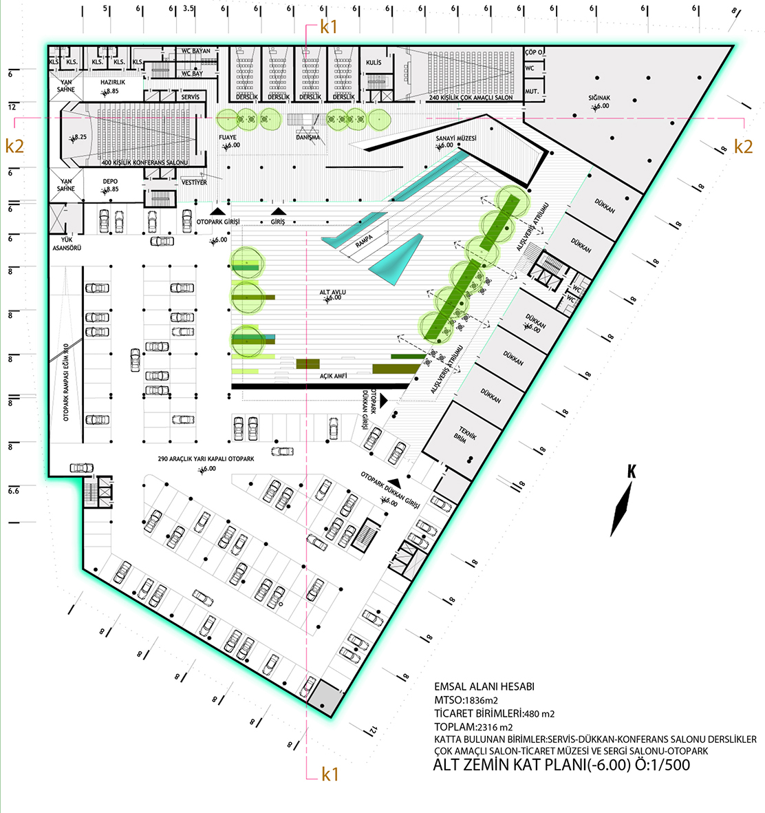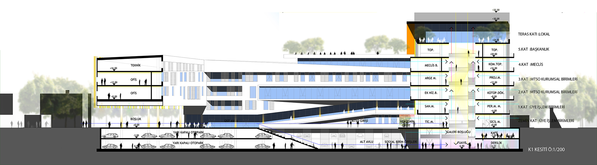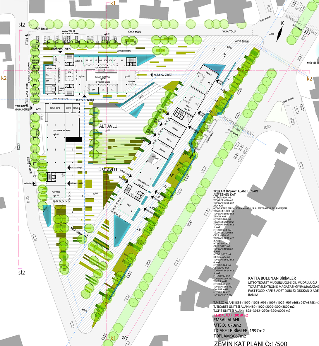 76024 sk.’tan ulaşılan otopark 2 katlı ve 290 araç kapasitelidir. Yarı kapalı düzenlenmiş otoparktan M.T.S.O. ofis ticaret birimlerine ve avlulara direkt ulaşım vardır. Projede zemin katlar ve bazı üst katlar ticarete ayrılmış ofis kısımları 2.ve 3.katta çözümlenmiştir.