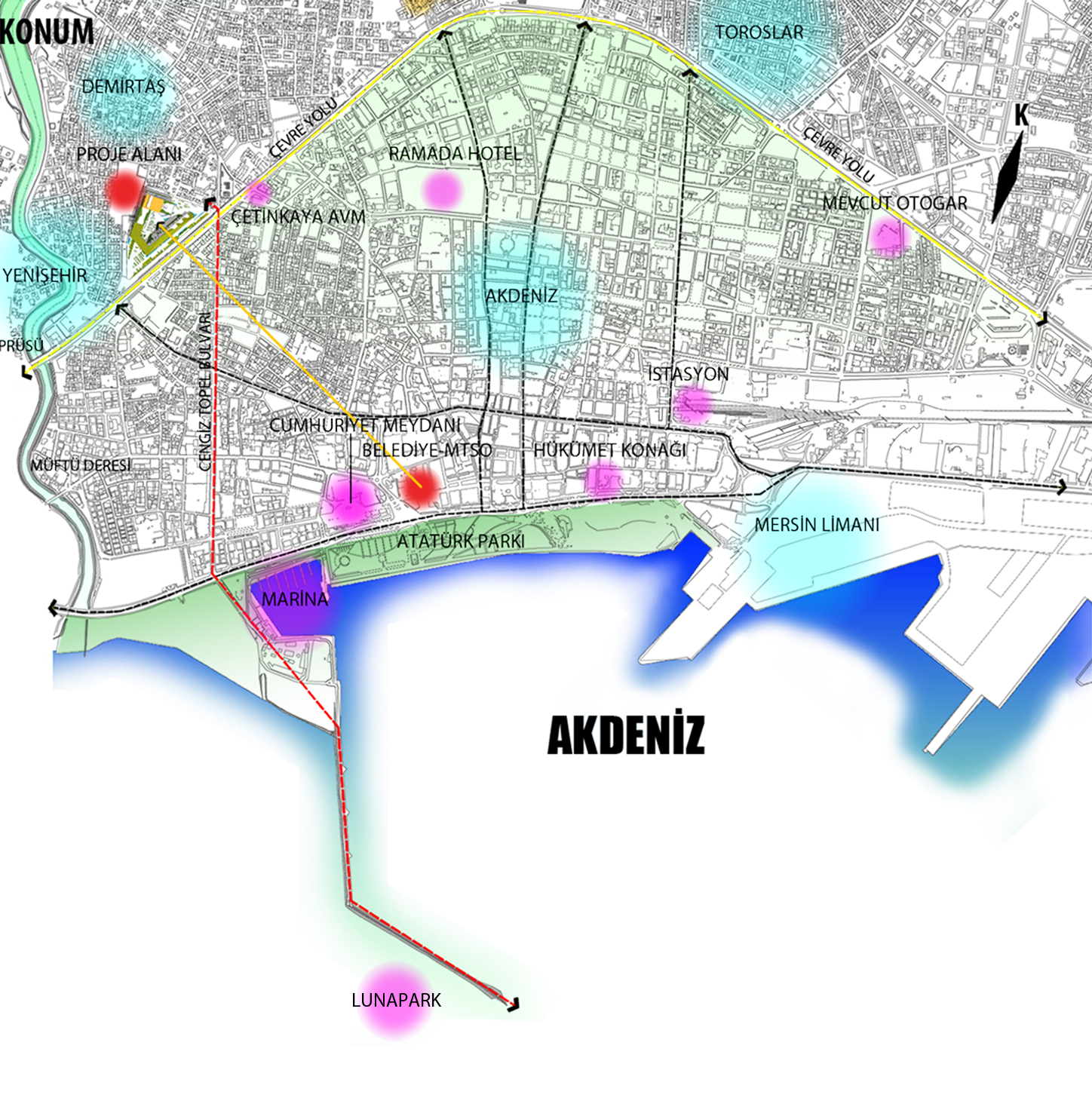 Proje alanı Adana ile Antalya’yı bağlayan çevre yolu üzerindedir. Bu yol gece gündüz yoğun şekilde işler, Mersin’in ulaşım omurgasıdır. Ses ve hava kirliliği fazladır. Alanın kuzey batı tarafında Demirtaş Mh. yer alır. Batı kısmında yer alan açık alan imar planında özel mülkiyet olarak görünmekte, park olan kısım ise proje alanını desteklemede cılız kalmakta önünde bulunan özel mülkiyet ile proje alanından kopmaktadır. Bu nedenlerle proje; kendi içine yönelerek, çevreden referans alıp bu referansın bir yerinden ona adapte olmak yerine kendisi bir referans noktası olmaya çalışmıştır.